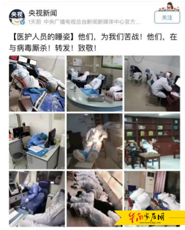 近日,央视新闻、光明网等媒体不约而同转发一条“医护人员的睡姿”的微博,牵动人的心弦,他们虽然被厚厚的防护服遮住了脸,他们的睡姿虽然不优雅,但是他们却感动了成千上万的网友。