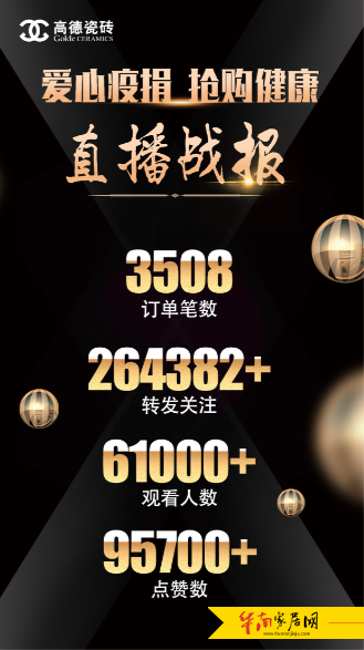 成绩绝非偶然,这场直播获得优异成绩的背后,是高德瓷砖总部和全国经销商的联动协作,是广大业主朋友的爱心和大义,是所有人坚信疫情一定会被战胜的信心和决心。