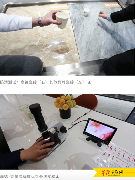 百闻不如一见,直播间中,工作人员在镜头前现场演示一系列实验向粉丝们展示了高德瓷砖在防滑、硬度、耐磨、防污等各项指标上的硬核实力,同时通过专业仪器展示了高德·能量砖“释放远红外线,改善人体微循环,促进新陈代谢”的健康功能。
