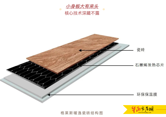格莱斯暖逸发热瓷砖由瓷砖-石墨烯发热芯片-环保保温膜三层结构复合而成,通过一体成型和自主研发的粘合技术,将智能发热芯片与瓷砖紧密结合,这样的结构可以有效保证石墨烯发热膜的热量只往上传递给瓷砖,不容易在地面以下流失,达到节能保温的效果。