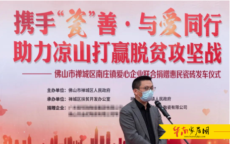 在2020年4月13日下午,由佛山市禅城区人民政府主办,禅城区扶贫开发办公室、禅城区南庄镇人民政府承办的【携手“瓷”善 · 与爱同行 助力凉山打赢脱贫攻坚战】佛山市禅城区南庄镇爱心企业联合捐赠惠民瓷砖发车仪式于华夏陶瓷博览城举行。