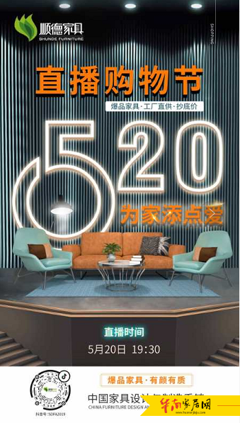 “520,为家添点爱”!5月20日晚7:30-10:30,顺德家具直播购物节,好物体验官培霖将在抖音平台,挑战顺德家具全网最低价,3000+厂家,超1000种品类,还有1元秒杀、红包雨、超级大锦鲤,一晚豪礼不停,最强折扣。史无前例的直播福利,已为广大消费者备齐,爆品家具,有颜有质,等着扮靓千万家庭。