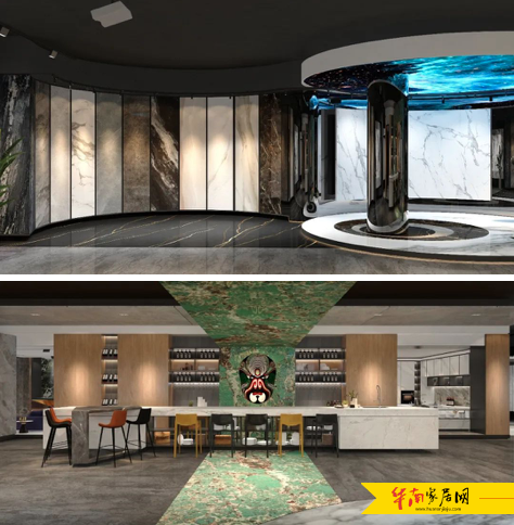 在岩板展厅的设计中,中国国潮、畅游海洋、人与自然、生命之源为四大创意点,皆采用岩板切割进行打造,大量运用3D效果,科技感满满。整体空间以新中式、北欧风格、360㎡的大平层打造体验式家居空间,大平层结合智能家居系统与品质工艺,实现定制化的生活场景,并打造了多个功能体验区,让客户通过多种体验区唤醒触动人心的体验之旅,为产品增添话语权。