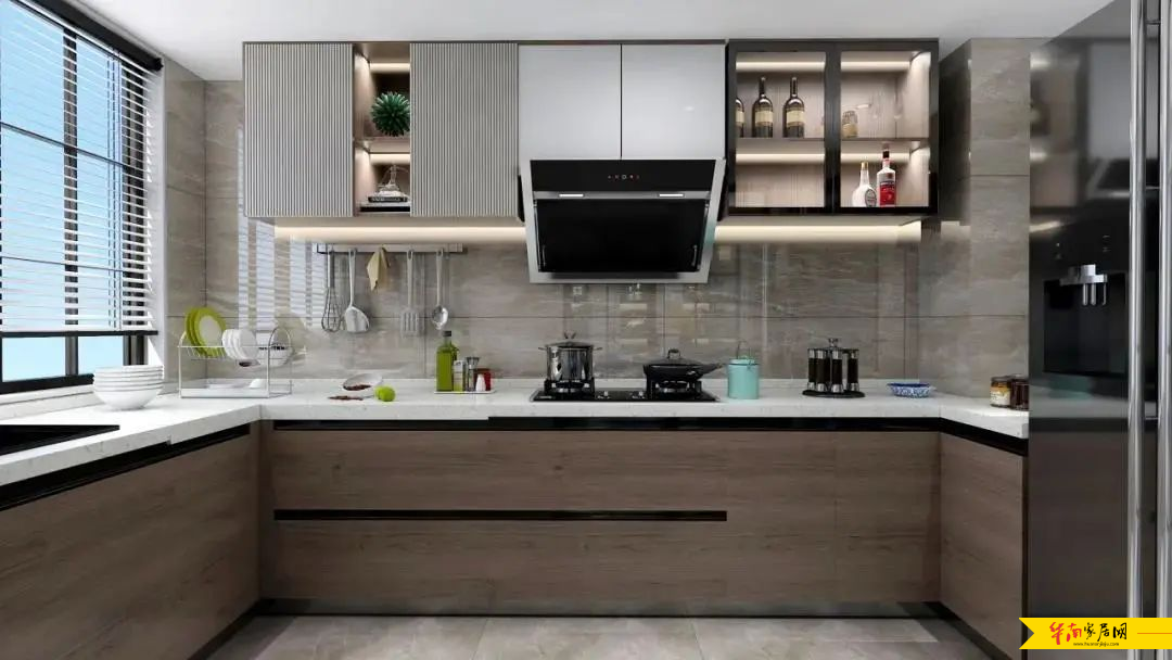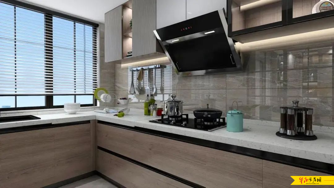 中式厨房由于油烟较大,并没有选择做开放式,U形橱柜中规中矩,墙砖选择亮面,增加通透,突显高级感,地砖则选用哑光,更注重实用性和舒适性。