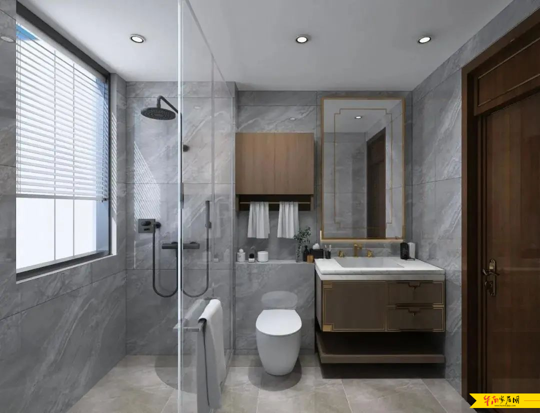 卫生间整体为浅灰色调,简易的干湿分离、一体式洗手盆、壁挂式收纳柜,尽显现代简约的精致,充分利用每一处的空间,又在这个基础上,融入了中式元素的内涵。