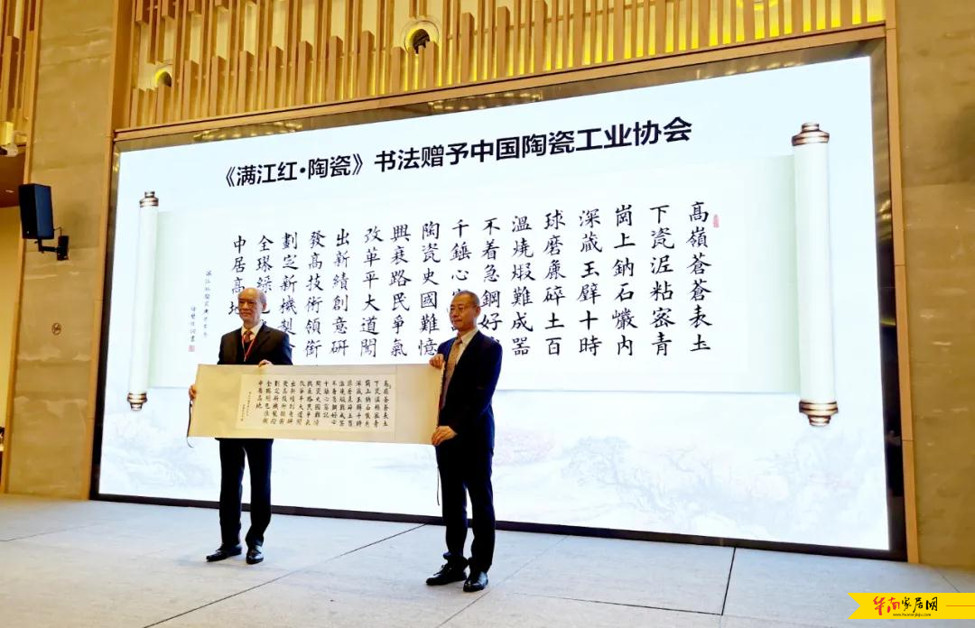 演讲最后,欧总为全体中国陶瓷人献上一首自己作词作曲的歌曲《满江红·陶瓷》,并向中国陶瓷工业协会赠送《满江红·陶瓷》书法一幅。