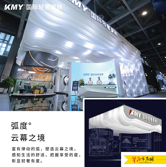 弧度°云幕之境是KMY奢度°国际馆的主场景,曲线构造的云幕覆盖整个空间,融入建筑设计大师扎哈•哈迪德对弧理解,用曲线对话世界,对直线的建筑构造进行颠覆,呈现出舒适轻松的氛围。