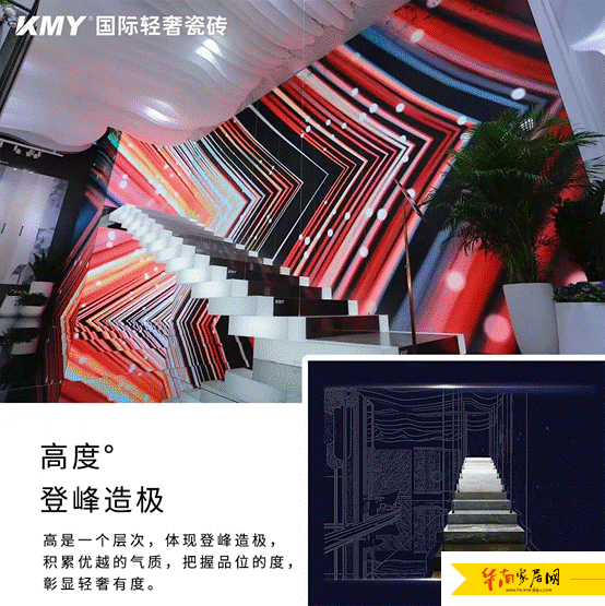 高度°登峰造极以云梯的形式呈现眼前,被65㎡LED屏幕半裹,一直向云端攀升,体现出KMY对进步的渴望和极致设计的追求。
