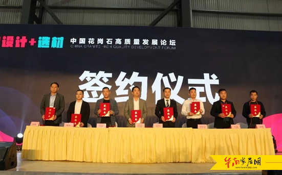 (中国花岗石直采平台董事长蔡栋梁与沧州华荣世纪市场建设有限公司董事长姚友好,以及甘肃酒泉、阿拉善左旗、山东五莲、新疆奇台、吉林蛟河、湖北麻城等六大花岗石产区代表共同上台签约)