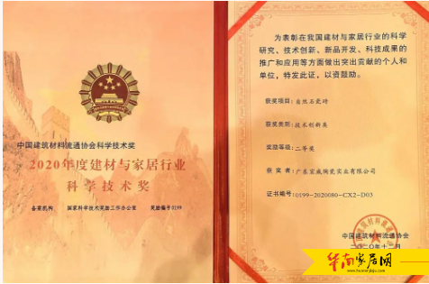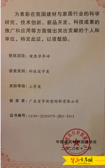 陶瓷行业一等奖空缺,最高奖为二等奖。宏宇集团有2项科技创新项目获得“2020年度建材与家居行业科学技术奖”,其中,“自然石瓷砖”荣获技术创新类二等奖,“健康净界砖”荣获科技进步类三等奖。国家科技部、工信部、商务部、全国总工会等相关领导现场为获奖单位颁奖,宏宇集团市场总监王勇代表企业参会并领奖。