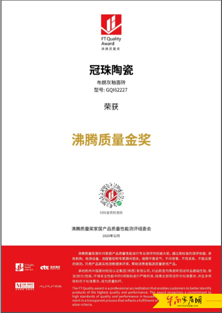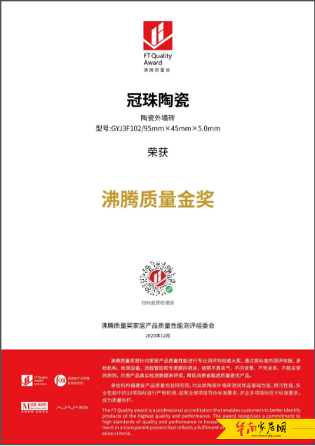 冠珠釉面砖、外墙砖荣获2020沸腾质量金奖
