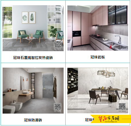 依托集团强大的技术支撑,冠珠瓷砖产品线完备,涵盖了市场上主流瓷砖品类,并不断研发,推出具有划时代意义的石墨烯智控发热瓷砖、冠珠岩板、连纹背景墙,及清新系列、防滑砖、景观砖等具有明显功能的产品,迎合消费升级、品质升级的市场需求,为终端用户带来全新居住体验。