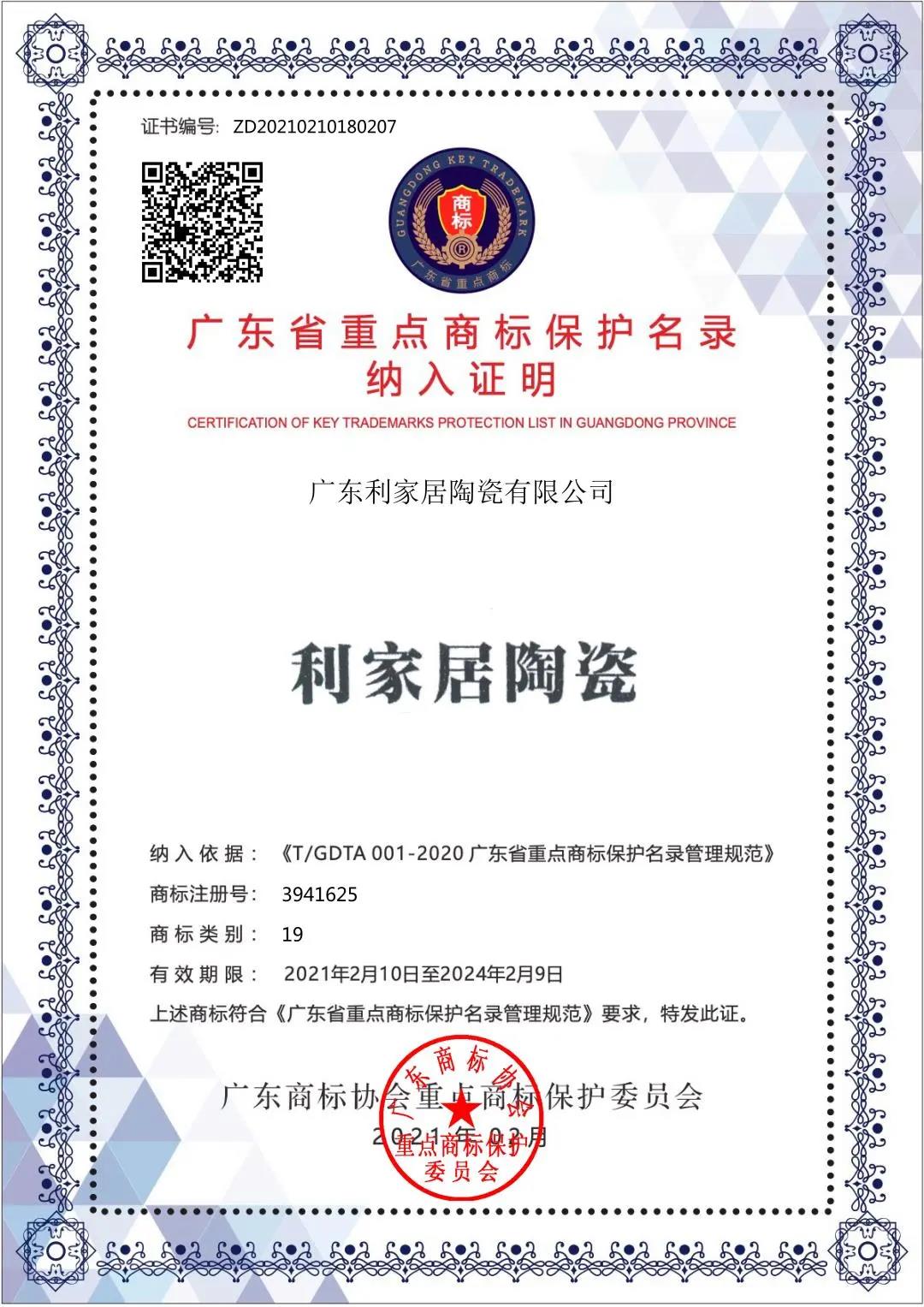 (华南家居网讯)近日,广东商标协会公布了《2020年度广东省重点商标保护名录》,包括华为、腾讯、格力、利家居陶瓷等在内的792件商标入选。“利家居陶瓷”入选广东省重点商标保护名录,企业实力获官方权威认证。