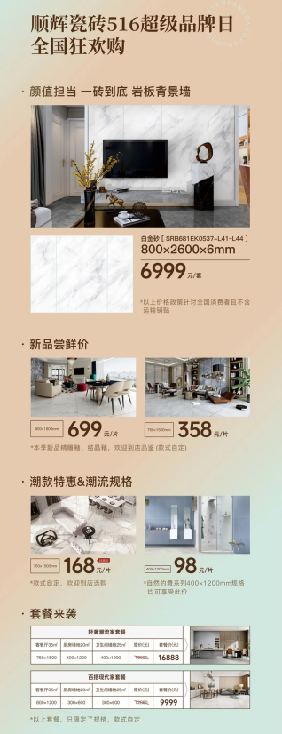 2021年5月16日作为第二届顺辉瓷砖“516超级品牌日”,结合新品发布、线上线下全国促销联动、全网营销、大咖背书、广告宣传、媒体助阵等一系列整合营销方式多位一体打造顺辉IP的全线曝光。