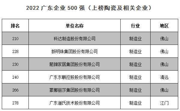 科达制造、新明珠集团、箭牌家居、东鹏、蒙娜丽莎、道氏技术6家陶瓷相关企业荣登“2022广东企业500强”榜单中,排名分别为第210位、228位、230位、240位、266位、278位。对比“2021年广东企业500强”上榜的陶企,2022年增加了蒙娜丽莎、箭牌家居2家陶企,科达制造、新明珠、东鹏、道氏技术名次有所提升。