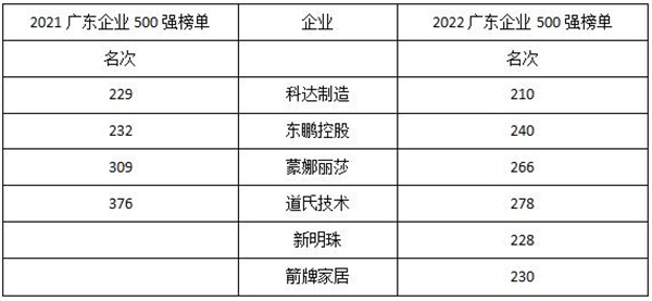 (华南家居网讯)10月12日,广东省企业联合会、广东省企业家协会发布了《2022广东500强企业发展报告》,同时发布了2022广东企业500强、2022广东民营企业100强、2022广东制造业企业100强、2022广东服务业企业100强等系列榜单。