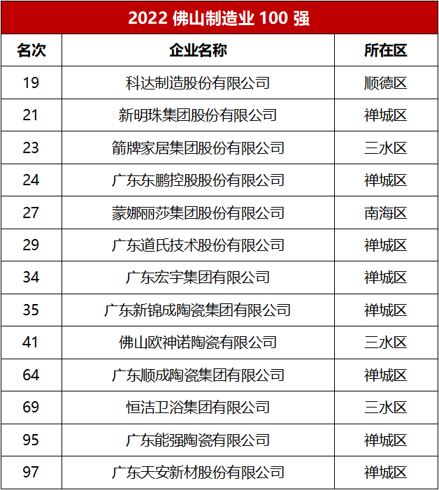 入选2022年佛山市制造业100强的陶企有蒙娜丽莎、道氏技术、新锦成、顺成、天安新材等13家企业。佛山制造业企业100强总营收10921.5亿元,同比增长24.56%,首次突破1万亿元,上榜门槛20亿元,同比大幅提高40.8%。