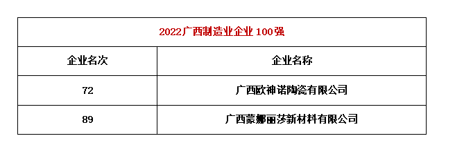 近日,2022广西企业100强、制造企业100强、民营企业100强等系列榜单发布,其中欧神诺、蒙娜丽莎上榜2022广西制造业企业100强榜单。2022广西企业100强企业总体规模首次突破2万亿元,达到20106.66亿元,较上年增长16.68%,继续保持较快增速;入围门槛大幅提升,达到26.41亿元,较上年的20.12亿元提高了31.28%。