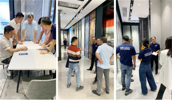 以产品为中心,市场为导向,通过销售精英的服务和引导,为客户快速挑选高质满意的轻奢瓷砖,从而带动绩效,是此培训环节的核心。实训中,分别对时下KMY潮流新品的产品优势和应用特点进行详尽解析,介绍目前先进工艺技术,刷新终端销售精英专业知识,以扎实深厚的基础为客户优质高效服务。