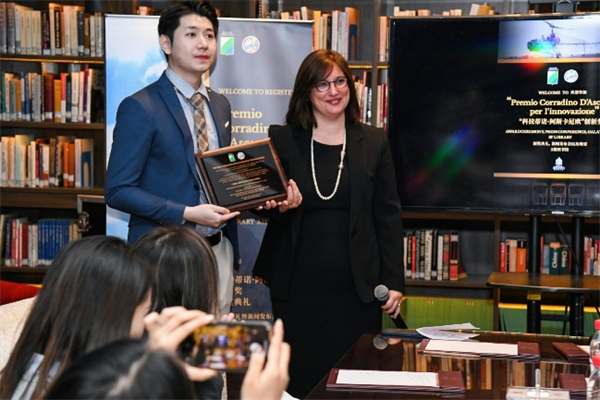 Ms.Tiziana D’Angelo assigns a plaque of recognition to Dongpeng