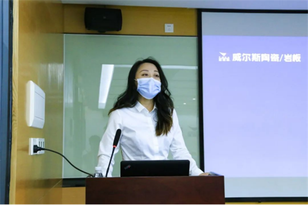 培训会上,产品部总监栾辉向大家分享当前国际瓷砖产品趋势,以及当前新产品设计元素灵感来源、工艺技术解读、产品空间应用案例展示等。