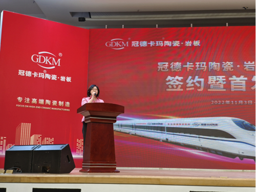 在冠德卡玛陶瓷·岩板高铁冠名签约暨首发仪式上,品牌销售总经理白保红女士表示:借力八纵八横高铁引擎时代,通过国家高铁名片的品牌提速之旅,不仅能够更快更强地提升品牌曝光度,精准覆盖庞大流动人群,引爆流量传播制高点,助推品牌声誉畅达全国。希望通过本次高铁冠名,让越来越多的家庭都能用得起产自广东的好瓷砖,为建设美丽中国添砖加瓦。