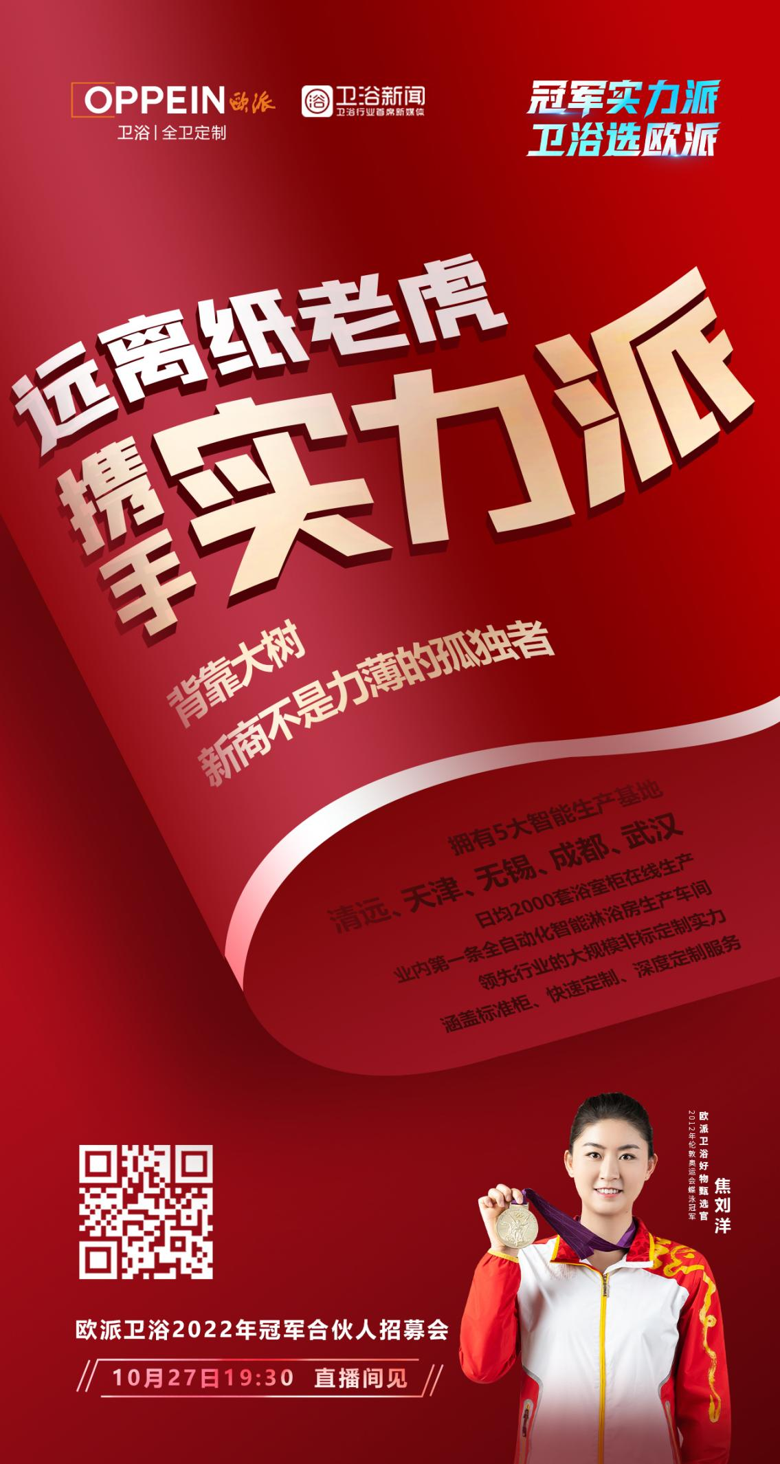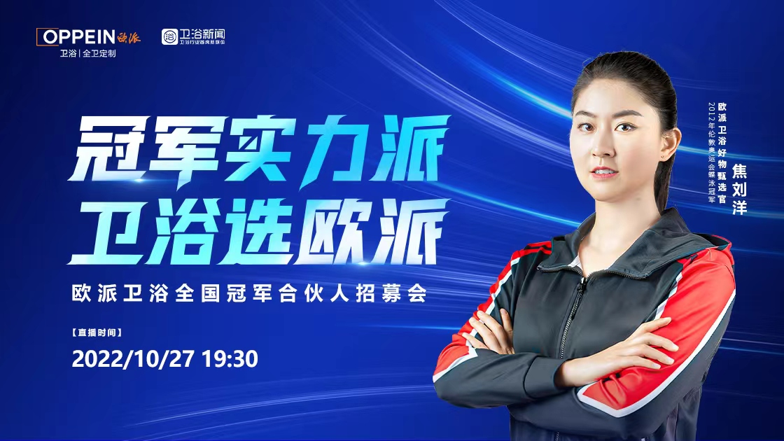 10月27 日19:30,“冠军实力派,卫浴选欧派”欧派卫浴2022年冠军合伙人招募会即将揭晓答案,并面向全国经销商开启新的财富通道。