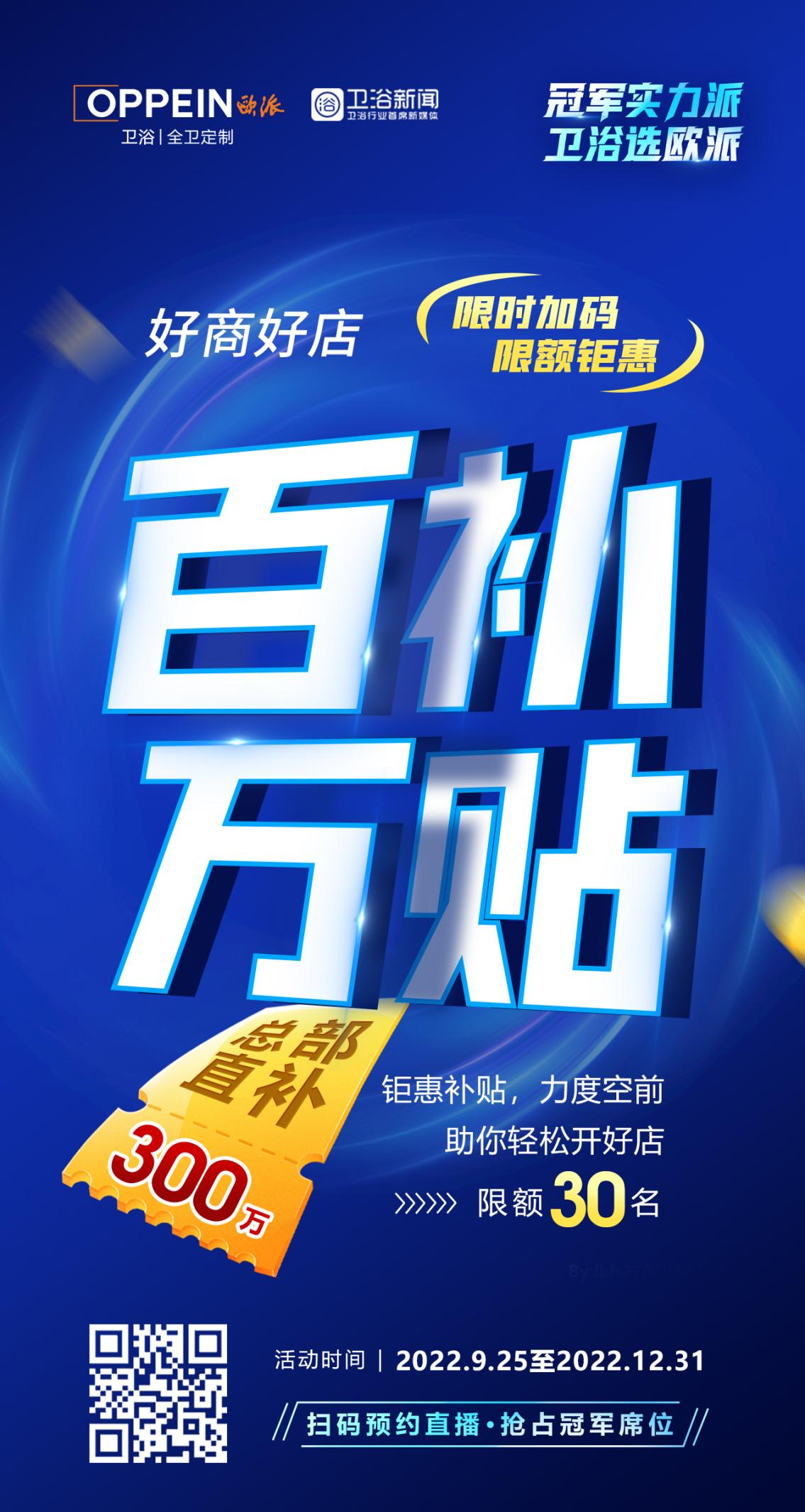 这将是一场优惠力度空前的惠商活动,也将是一场竞争激烈的席位争夺赛!10月27 日19:30,登陆欧派卫浴招商会直播间,锁定冠军品牌,抢占冠军席位,开拓更为广阔的财富“蓝海”,成就一生事业!