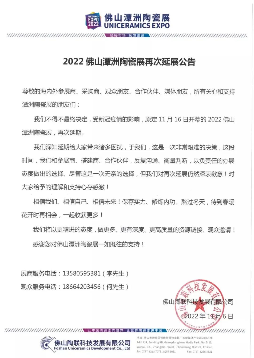 11月5日,佛山潭洲陶瓷展官方发布通知,受新冠疫情的影响,不得不最终决定:原定11月16日开幕的2022佛山潭洲陶瓷展再次延期。这是2022佛山潭洲陶瓷展继7月20日延期后的又一次延期,延期的原因都是受疫情影响。值得注意的是,通知并没有明确展会的具体举办时间,不少业内人士都认为,按照目前的疫情防控形势,今年很大概率不会再举办了。