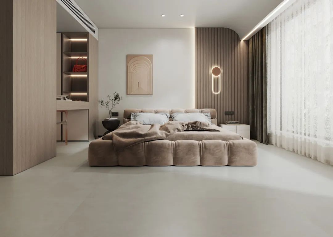 即不同深浅的同色系家具软装与墙地面进行装饰搭配,既和谐又显韵律感。