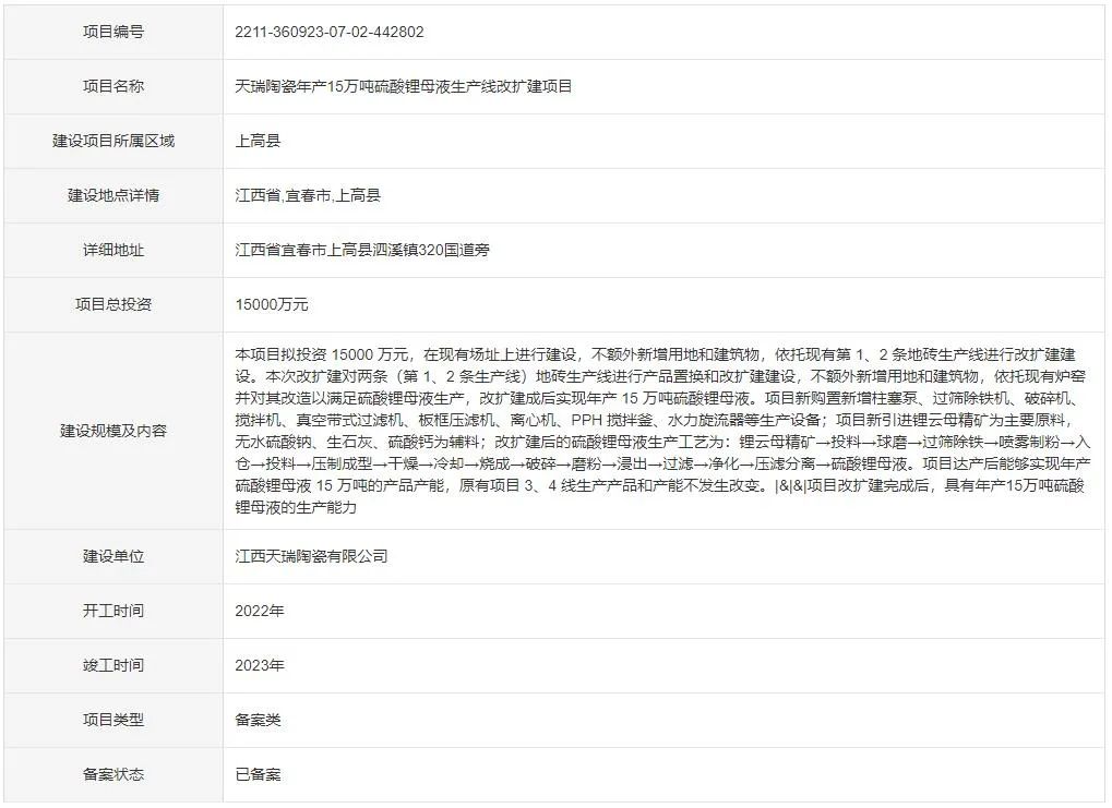 11月25日,天瑞陶瓷年产15万吨硫酸锂母液生产线改扩建项目获批。该项目拟投资15000万元,在现有场址上进行建设,不额外新增用地和建筑物,依托现有第 1、2 条地砖生产线进行进行产品置换和改扩建建设,不额外新增用地和建筑物,并依托现有炉窑并对其改造以满足硫酸锂母液生产,改扩建成后实现年产15万吨硫酸锂母液。