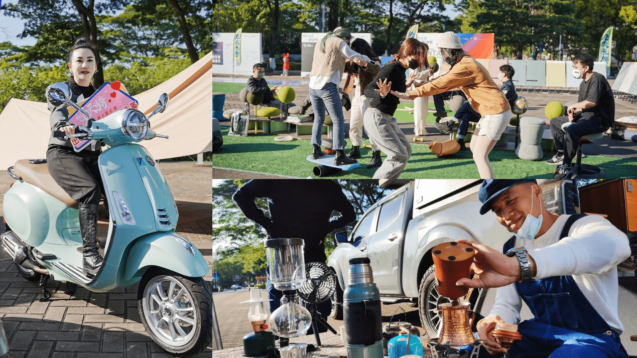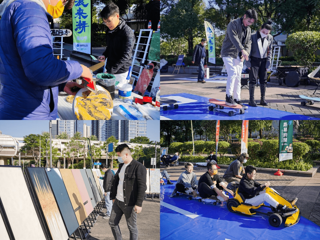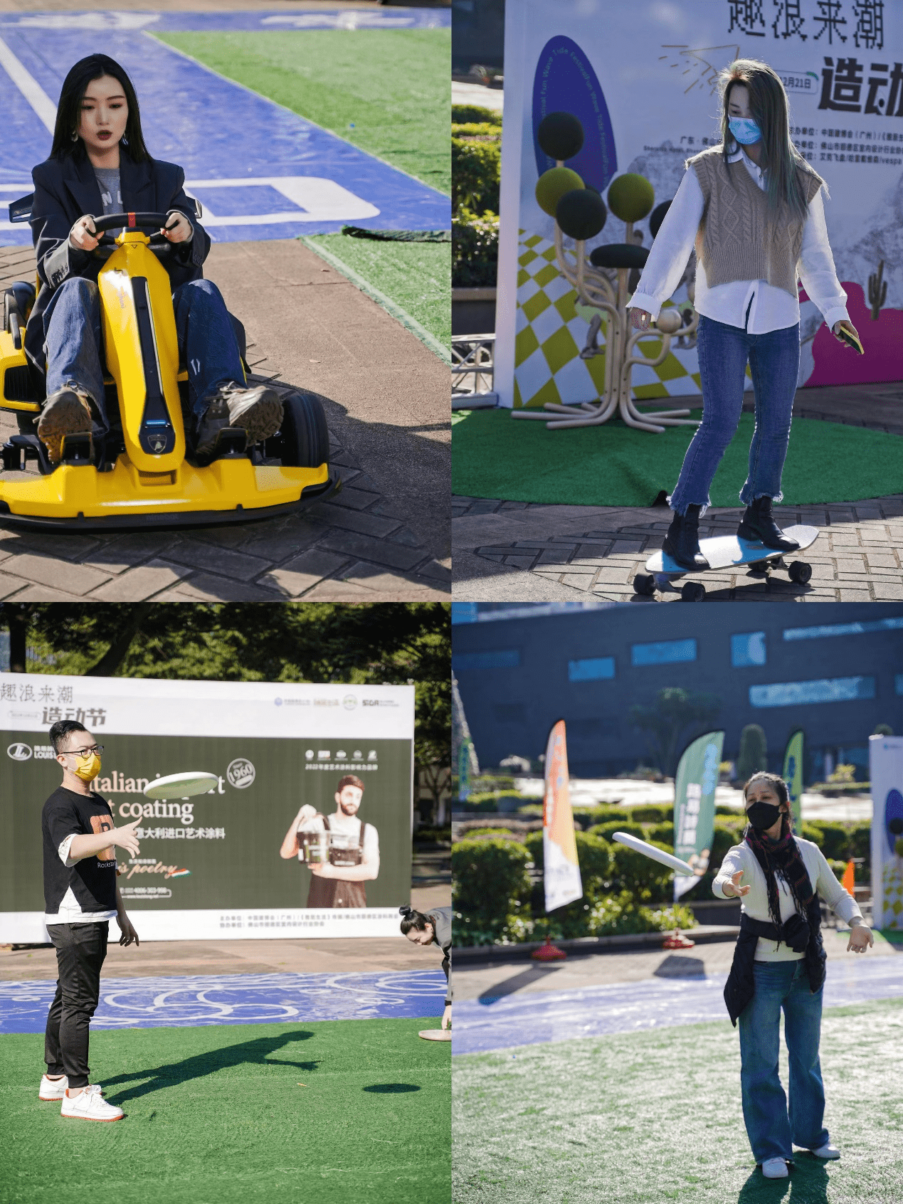 下午,以城市文化潮玩运动社交拉开了多元的社交圈层序幕。户外现场主题活动主要有飞盘手绘、滑板涂鸦,飞盘体验、陆冲/滑板教学、平衡对抗比赛、兰博基尼卡丁车和哈雷机车交流、户外露营手冲咖啡分享等。