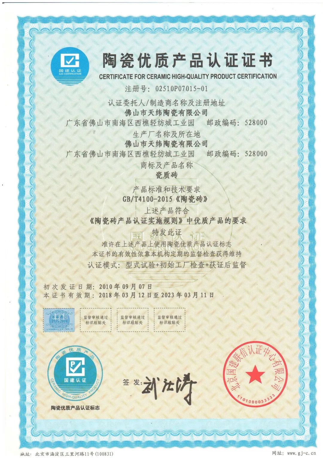 连续多年荣获“陶瓷优质产品认证证书”