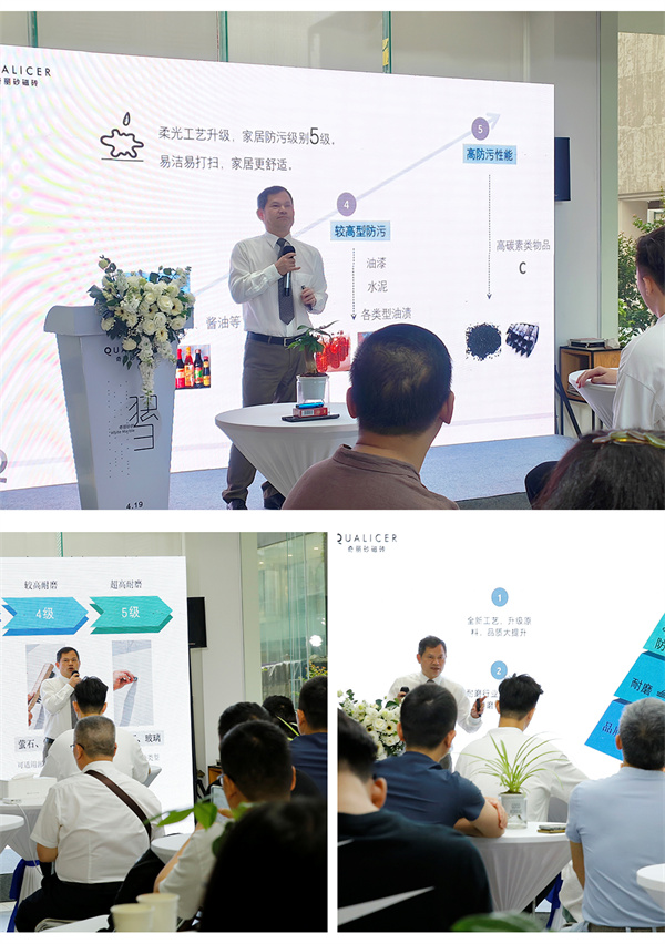 独具一格是产品的灵魂,超强品质是产品的肉体。奇丽砂国内营销总经理罗坡文先生对本次发布会的新品进行了详尽的讲解。奇丽砂本次新品秉承企业文化,产品全新升级。打造更具特色产品的同时,又更加贴近家居生活。新产品耐磨性极大提高,耐磨转数测试达到6000转,莫氏硬度测试超5级硬度,产品使用持久如新不再是概念,而是现实写照;其次新品防污性能达到5级超高级防污,无惧施工到家居使用过程所能遇上的种种问题。