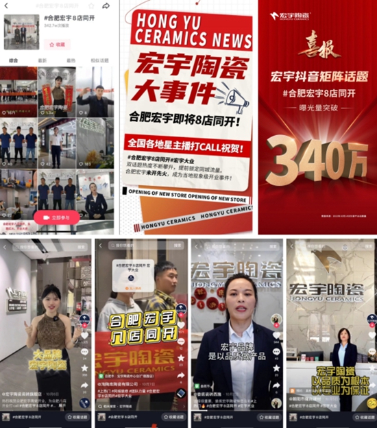 据悉,宏宇陶瓷10月在合肥即将有8个店同时开业,开业话题仅3天即突破340w+曝光量!宏宇陶瓷门店未开先火,而流量密码竟是宏宇全国经销商。行业门店开业爆破推广大家都已经习以为常,但这次发现了新玩法,宏宇陶瓷全国门店、星主播们以拍视频给合肥门店打Call形式,把【#合肥宏宇8店同开】推至风口,轻松撬动百万流量,迅速出圈。