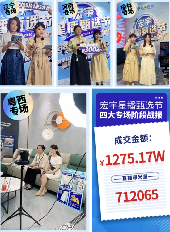 据深入了解,宏宇陶瓷自9月以来,通过总部联动终端新锐星主播双向发力,先后在榆林、河南、辽宁等落地多场重点区域直播专场活动,聚焦同城引流,深入挖掘区域流量池,实现超高流量变现,成交额超1200w+,跑出业绩增长加速度。为了让终端更好拓展渠道,总部甚至还成立了“飞行小组”,在终端协助门店星主播和运营团队拉新、提高留存率,帮助经销商打造线上线下消费场景闭环,实现品牌声量和销量全线飘红。