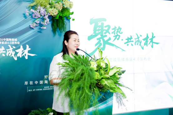 在全场期待中,中国陶瓷城总经理 龙清玉深度解读中国陶瓷城品牌首店4.0理念背后的实践与愿景。龙清玉女士在分享中回溯了品牌首店的演进历程:从1.0的“定标准”,到2.0的“铸内核”,再到3.0的“共出海”,今天,正式进入 4.0的“聚成林”时代。