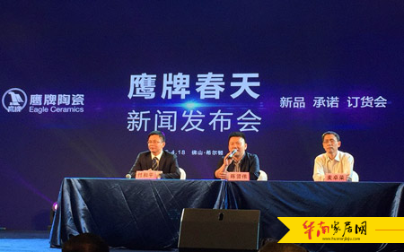(华南装修家居网讯)4月18日,鹰牌陶瓷在广东佛山希尔顿酒店举行主题为“鹰牌春天”的新闻发布会,隆重发布鹰牌陶瓷2016年新品、7天无条件退货的匠心承诺,3.0011亿元的春季订货会成果。鹰牌集团总裁林伟、鹰牌集团副总裁陈贤伟、鹰牌营销中心总经理付和平等企业领导,以及包含新华网、人民网、南方日报、广州日报,华南装修家居网、华人设计师网等多家主流媒体、家装界名流莅临发布会现场,共同见证鹰牌春天魅力。