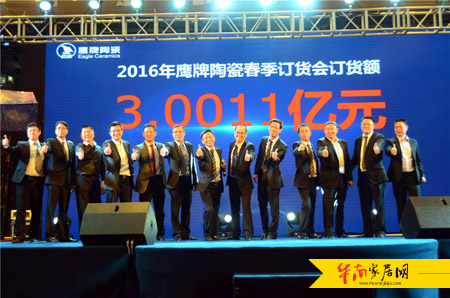 发布会上,鹰牌营销中心总经理付和平公布了鹰牌春季订货会上订货额,鹰牌陶瓷两小时便创下了3.0011亿元的订货额,这样的成绩足以彰显鹰牌陶瓷强大的品牌实力与渠道销售力。在陶瓷行业整体低迷的背景下,鹰牌在这个春天所创造的奇迹,给了行业足够的信心。