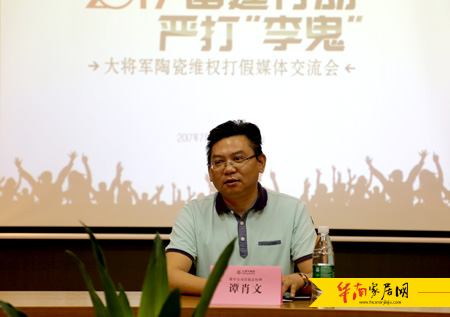 (华南家居网讯)7月25日,主题为“雷霆行动 严打李鬼”大将军陶瓷维权打假行动媒体见面会佛山召开。会上,将军公司营销总经理谭肖文先生详细介绍了大将军陶瓷太原维权打假的成果,并呼吁政府部门和陶瓷行业,共同重视陶瓷品牌权益的保护,严打行业“李鬼”,保护陶瓷品牌和消费者权益,保障陶瓷行业健康发展!陶城报、华南家居网、华人设计师网等众多行业主流媒体出席本次新闻发布会。
