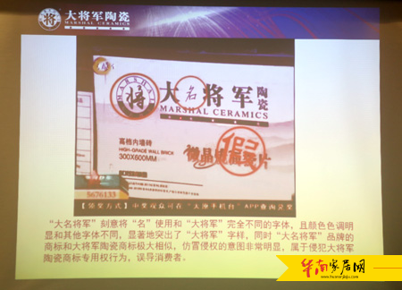 近年来,不少外地的陶瓷企业假冒佛山陶瓷的品牌、商标,令不少佛山品牌企业苦不堪言。作为陶瓷行业的领导品牌之一,大将军陶瓷也未能幸免。近段时间,大将军陶瓷在山西省内及周边省份陆续接到投诉,均称在当地建材市场存在商户销售假冒大将军陶瓷品牌的“大名将军”品牌的产品。显而易见的是,“大名将军”品牌在包装箱等处,刻意将“名”使用和“大将军”完全不同的字体,且颜色色调明显和其他字体不同,显著地突出了“大将军”字样,造成和大将军陶瓷商标非常近似的实际效果,同时“大名将军”品牌的商标中间使用完全相同的“将”字样,配色位置相同,仿冒侵权的意图非常明显,属于侵犯大将军陶瓷商标专用权行为,误导消费者。