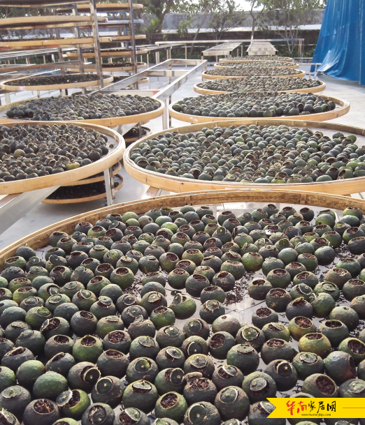 廖总:生晒柑普我们有比较好的条件,你们也看到了,我们晒场的条件很好,隔壁是江边,北边就是一千亩的葵树。只要天气条件允许我们都会采用生晒工艺,全生晒一般需要半个月到20多天。